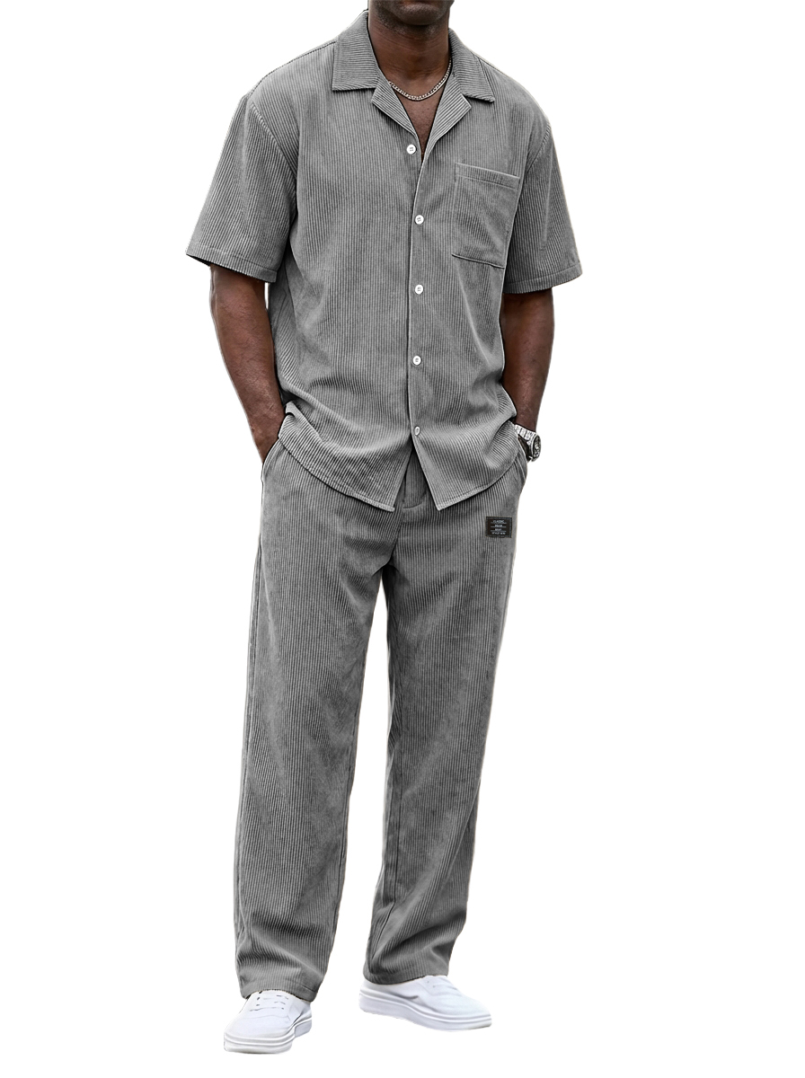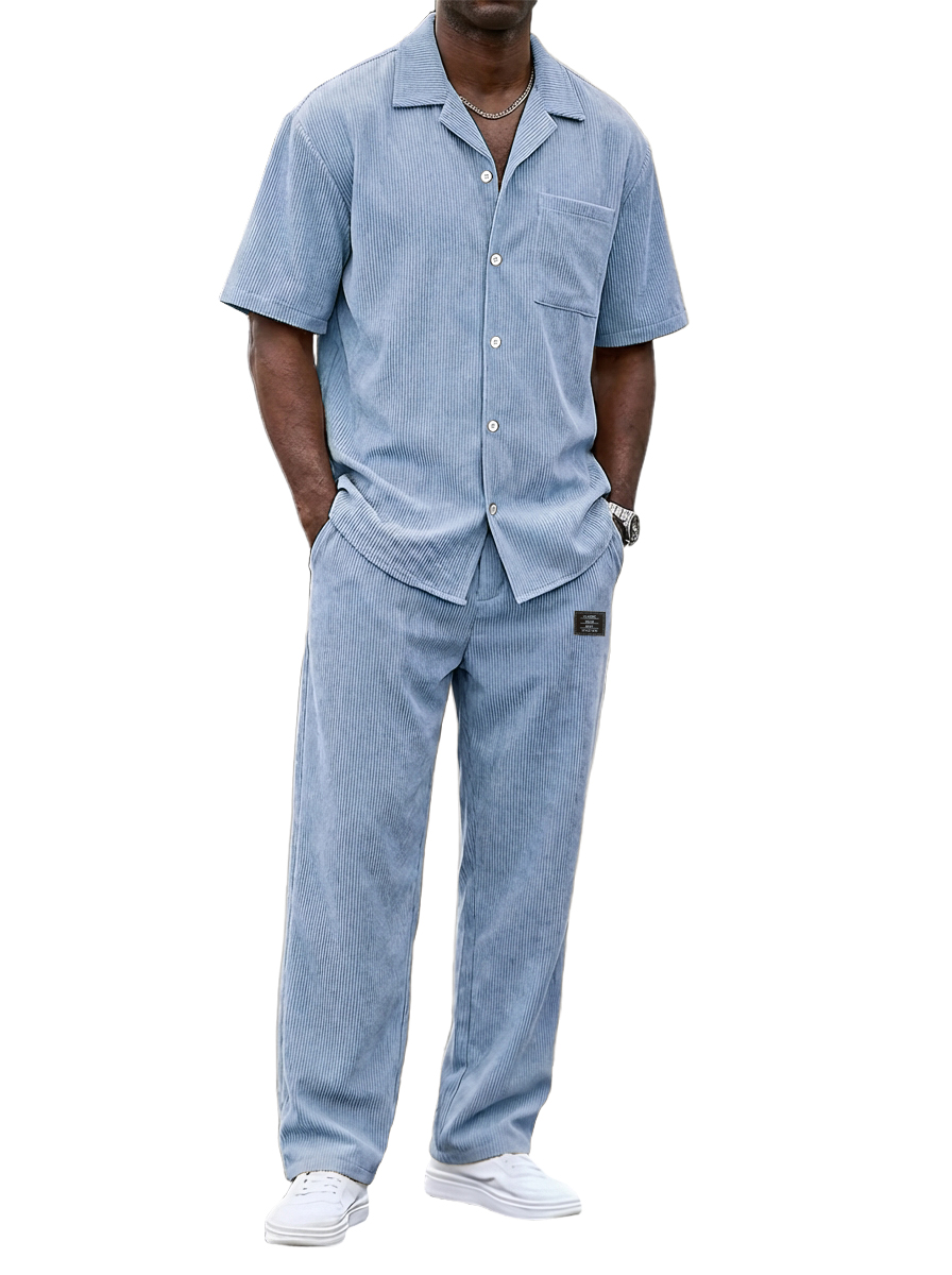 Herren Vintage Corduroy Freizeit Kurzarmhemd und lockere gerade Hosen Set