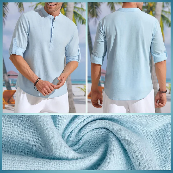 Der Stehkragen sitzt perfekt am Hals und verleiht ihm eine gepflegte und lässige Ausstrahlung. Der Halsausschnitt ist mit 4 Knöpfen zur Anpassung versehen und die Manschetten haben einen einzigen Knopf, der nach Belieben hoch- oder heruntergerollt werden kann. Lässiger und atmungsaktiver.