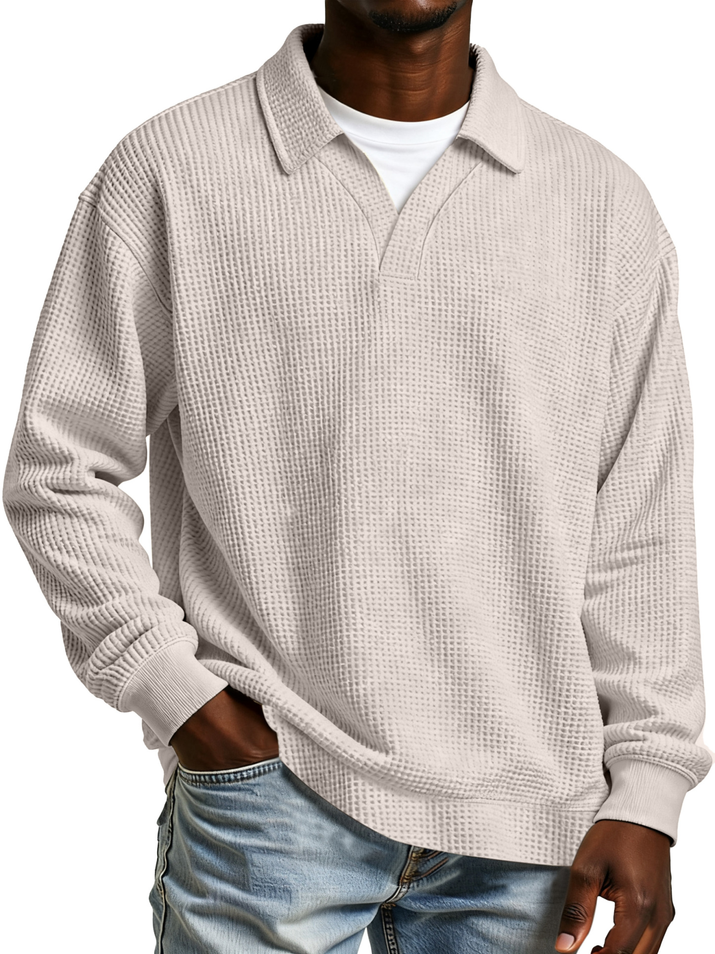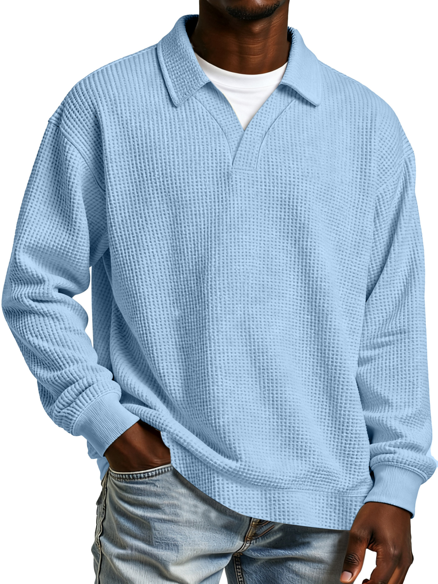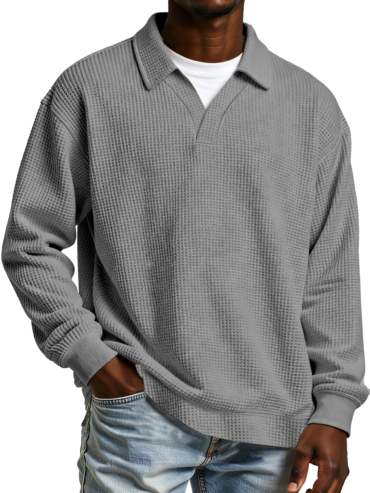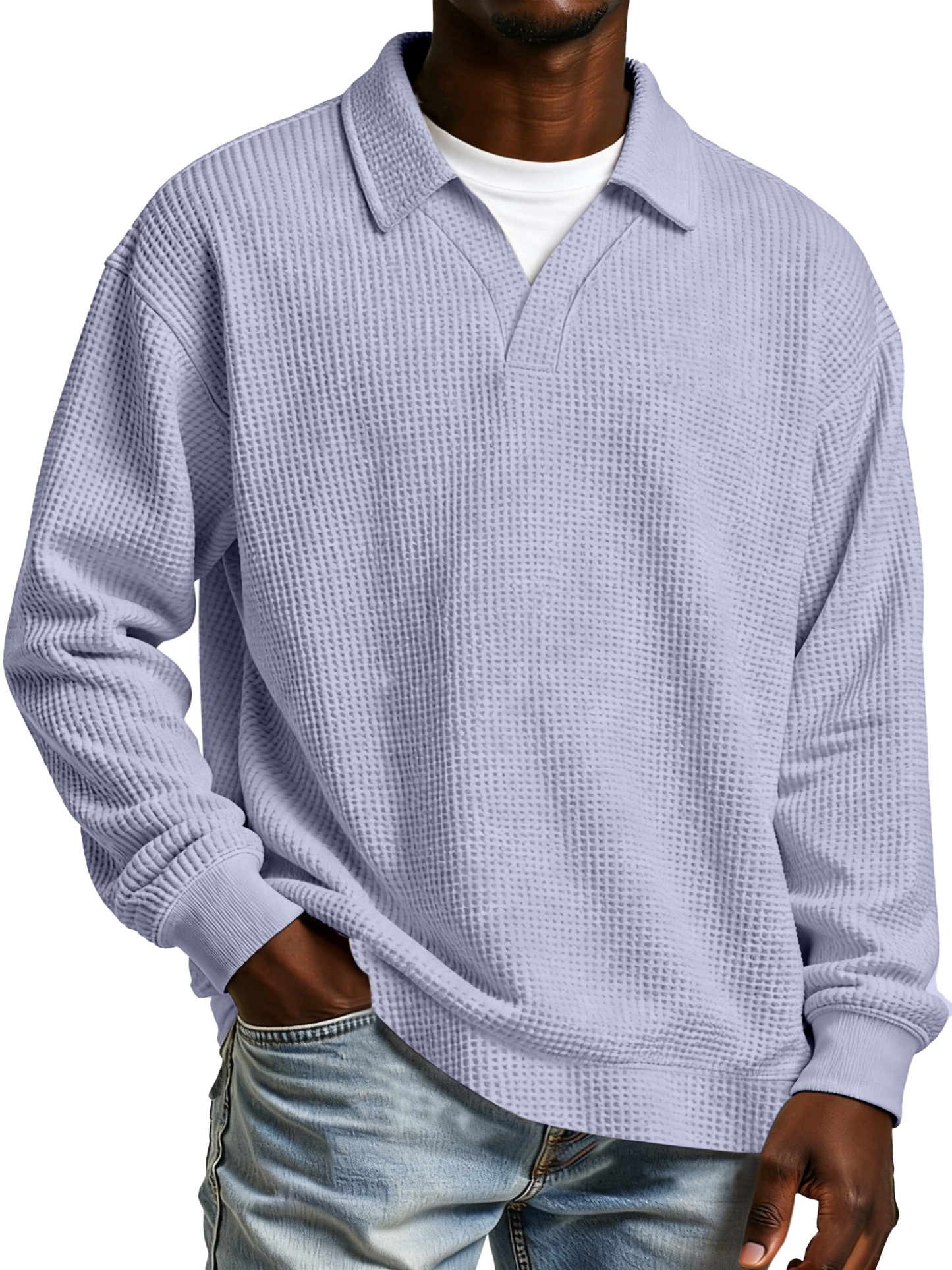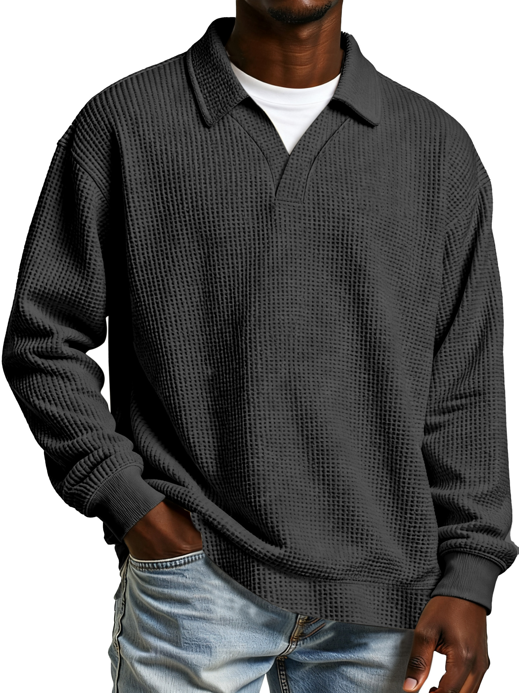 Herren Freizeit Poloshirt mit einfarbigem Waffelmuster, Fake-Zweiteiler, mit Revers und langen Ärmeln