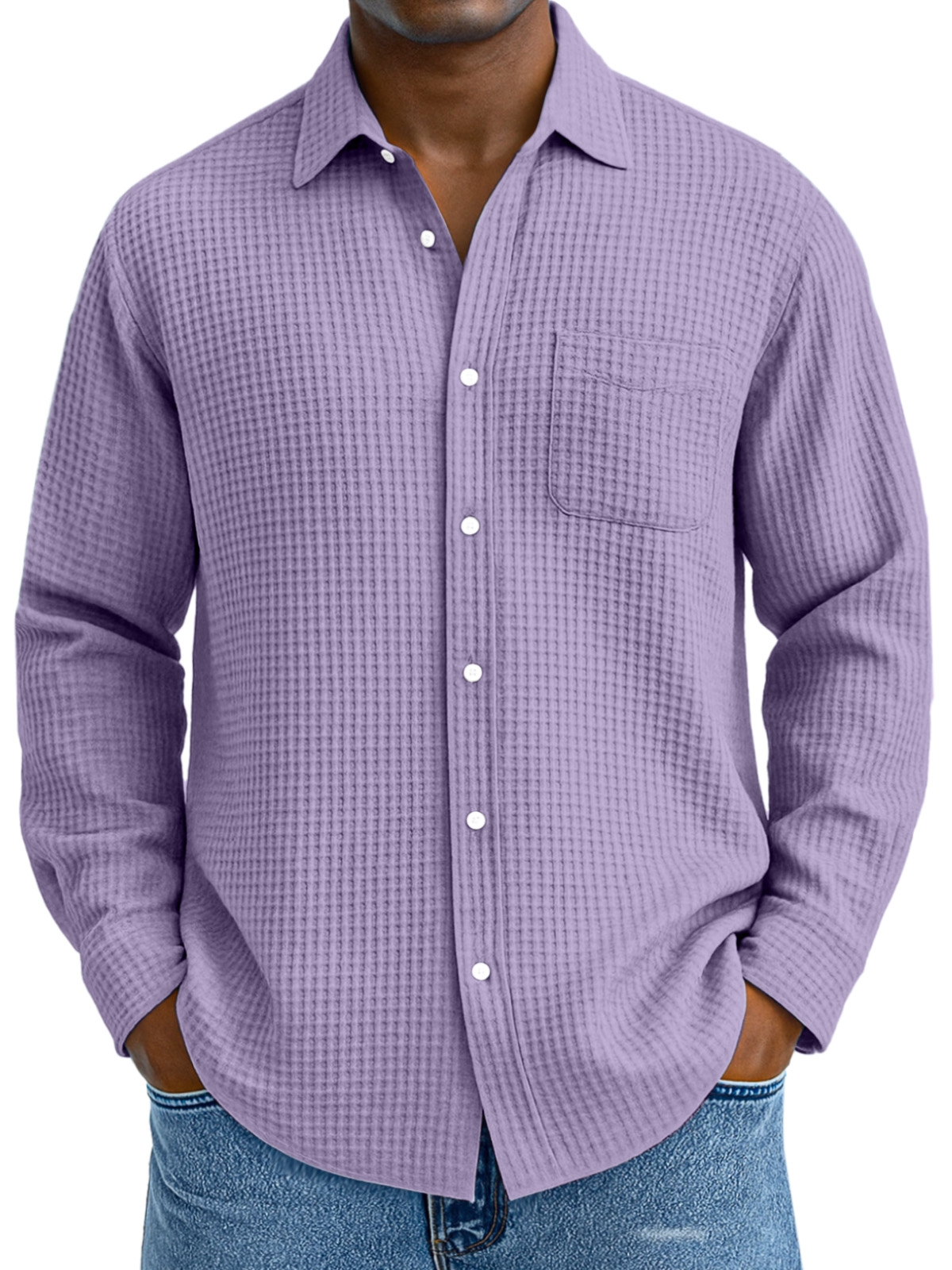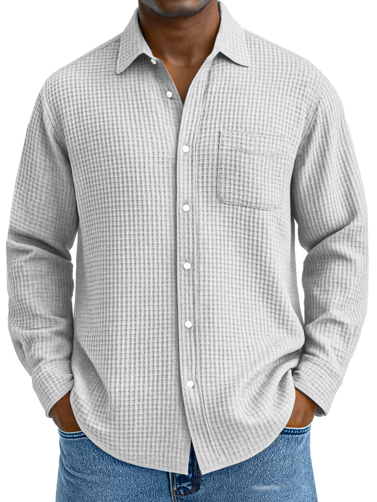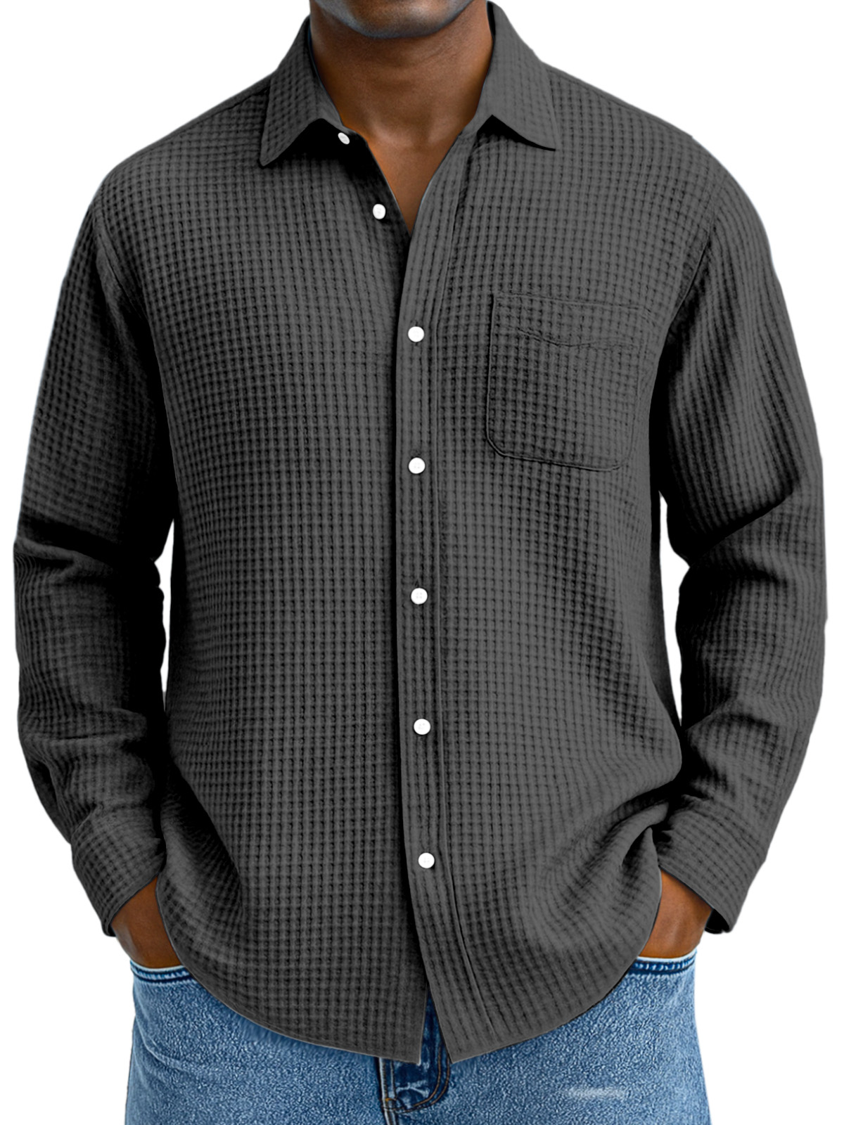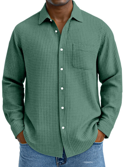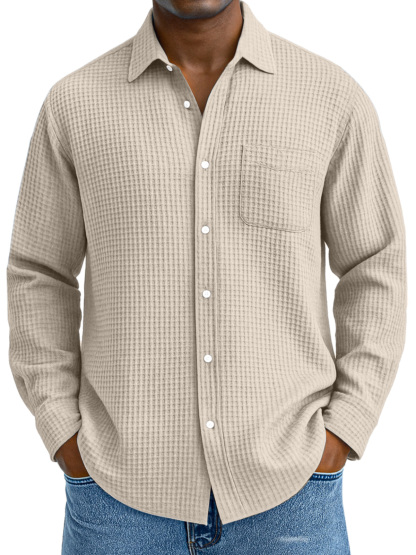 Herren Freizeit Hemd mit einfarbigem Waffelmuster, lockerer Kragen, langen Ärmeln und Taschen