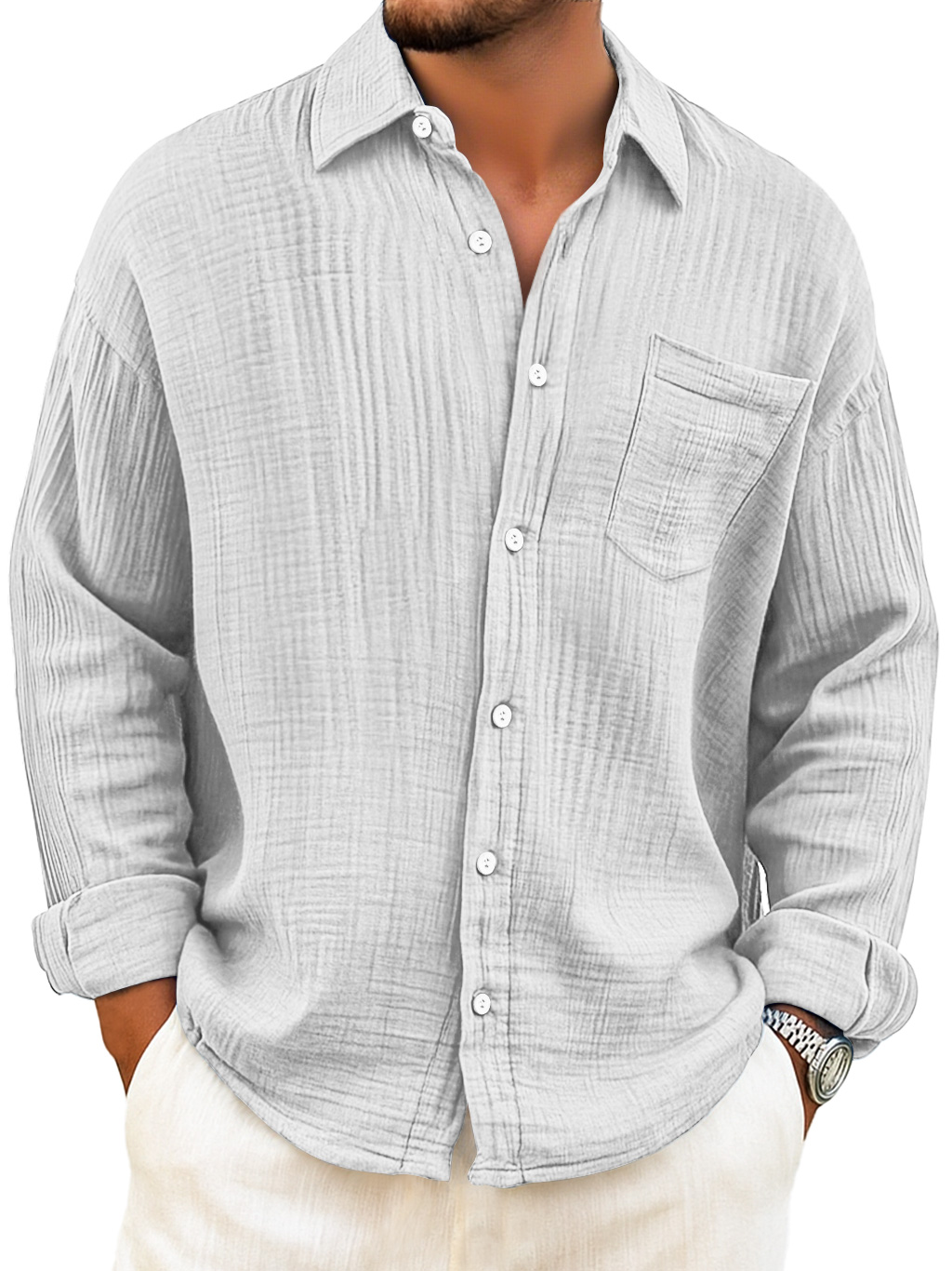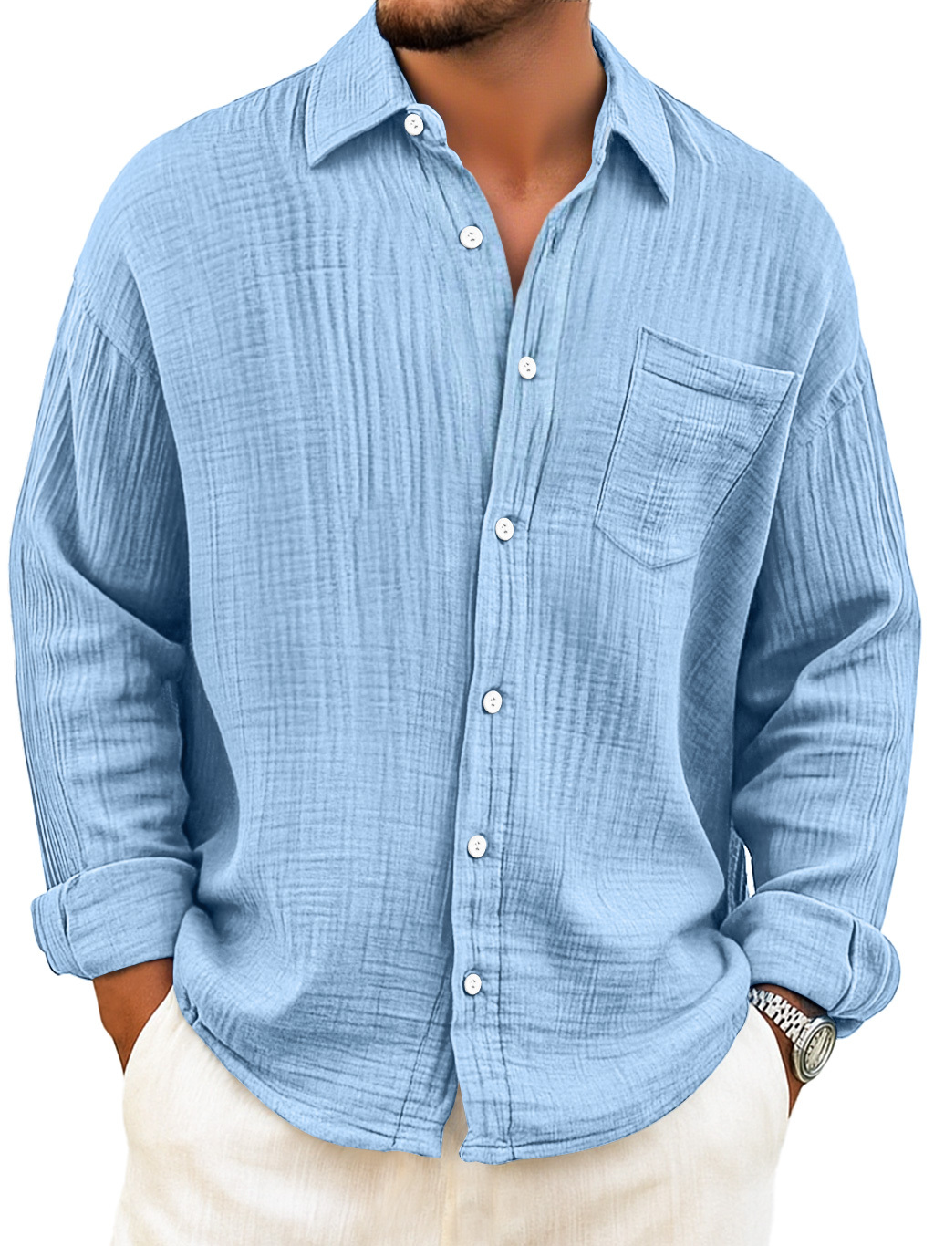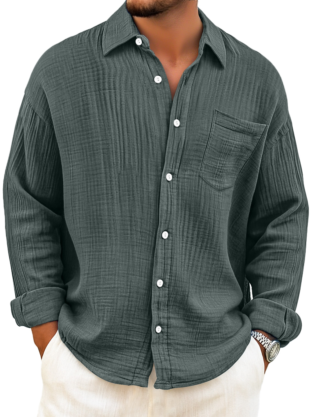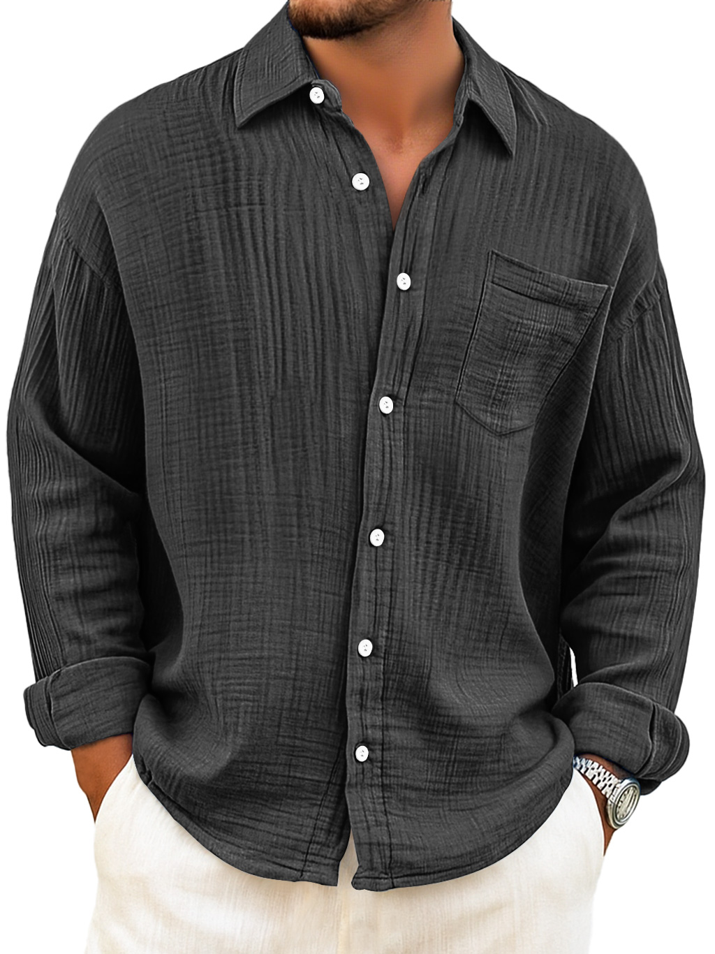 Herren Tägliches Atmungsaktives Baumwoll Falten Freizeit Tasche Langarmhemd