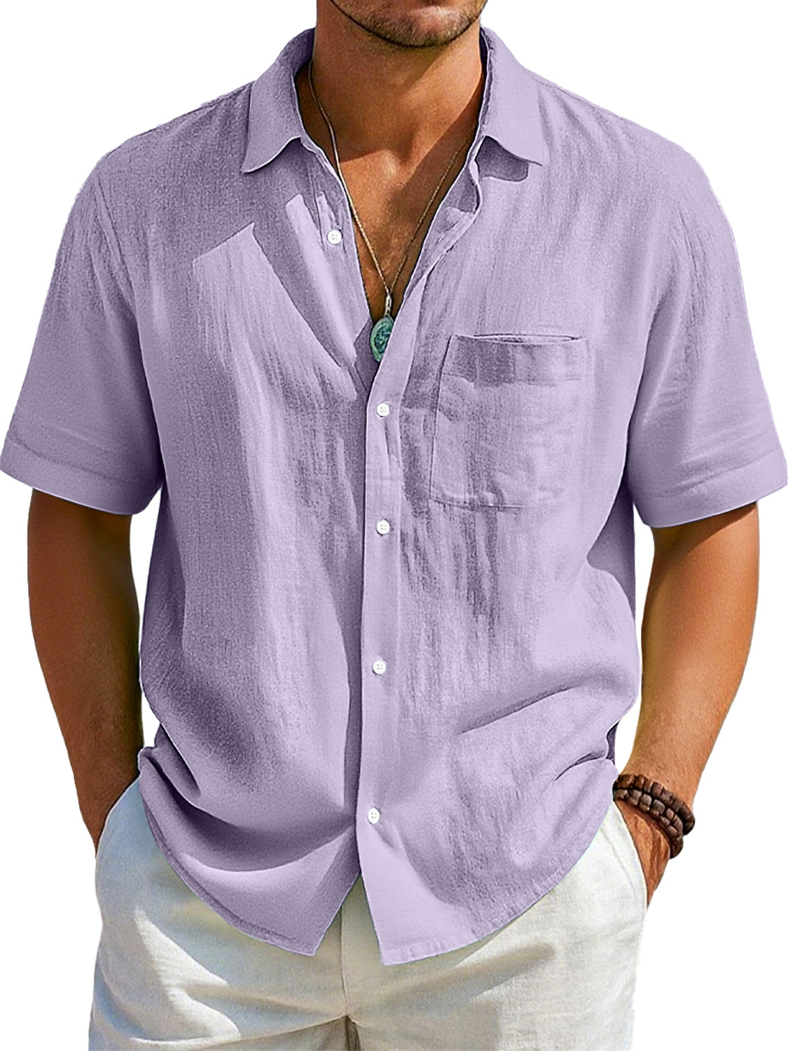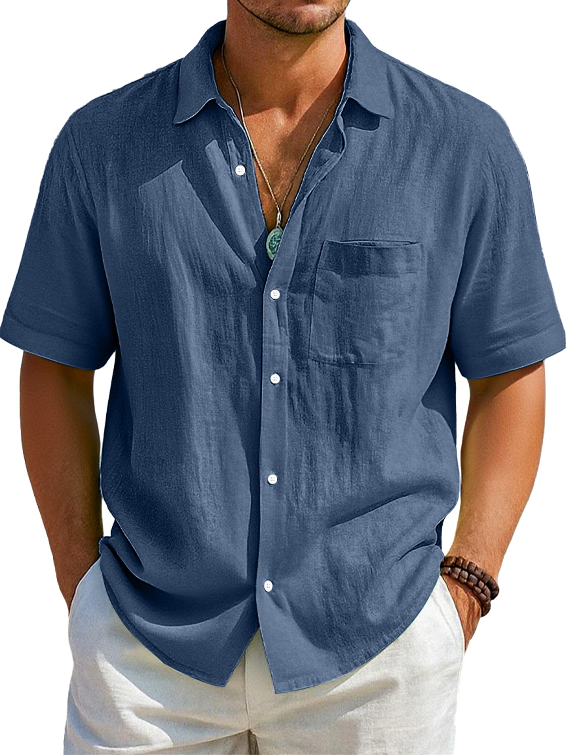 Herren Daily Imitation Leinen Freizeit Tasche Revers Bequem Kurzarm Hemd
