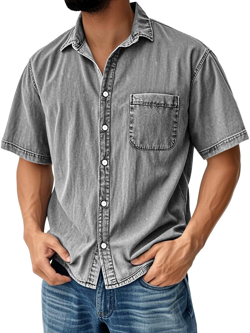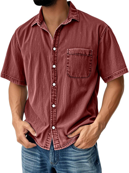 Herren Retro Freizeit Kragen Tasche Einfarbig Kurzarmhemd