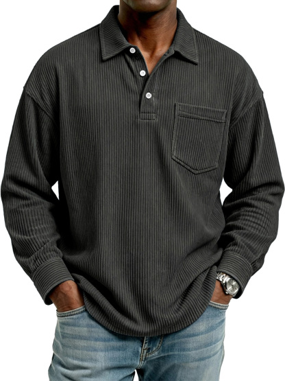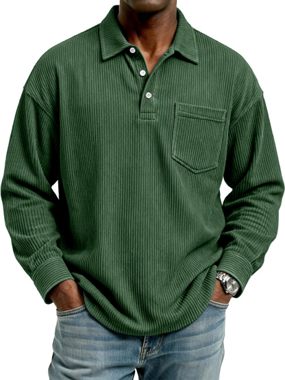 Herren Retro Corduroy Revers Knopf Freizeit Tasche Langarm Polohemd