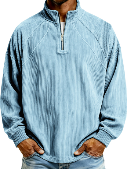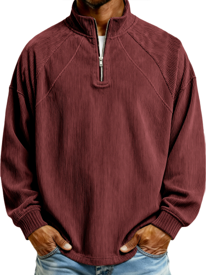 Herren Einfaches Corduroy Geripptes Viertel-Reißverschluss Raglan Ärmel Pullover Polo-Shirt