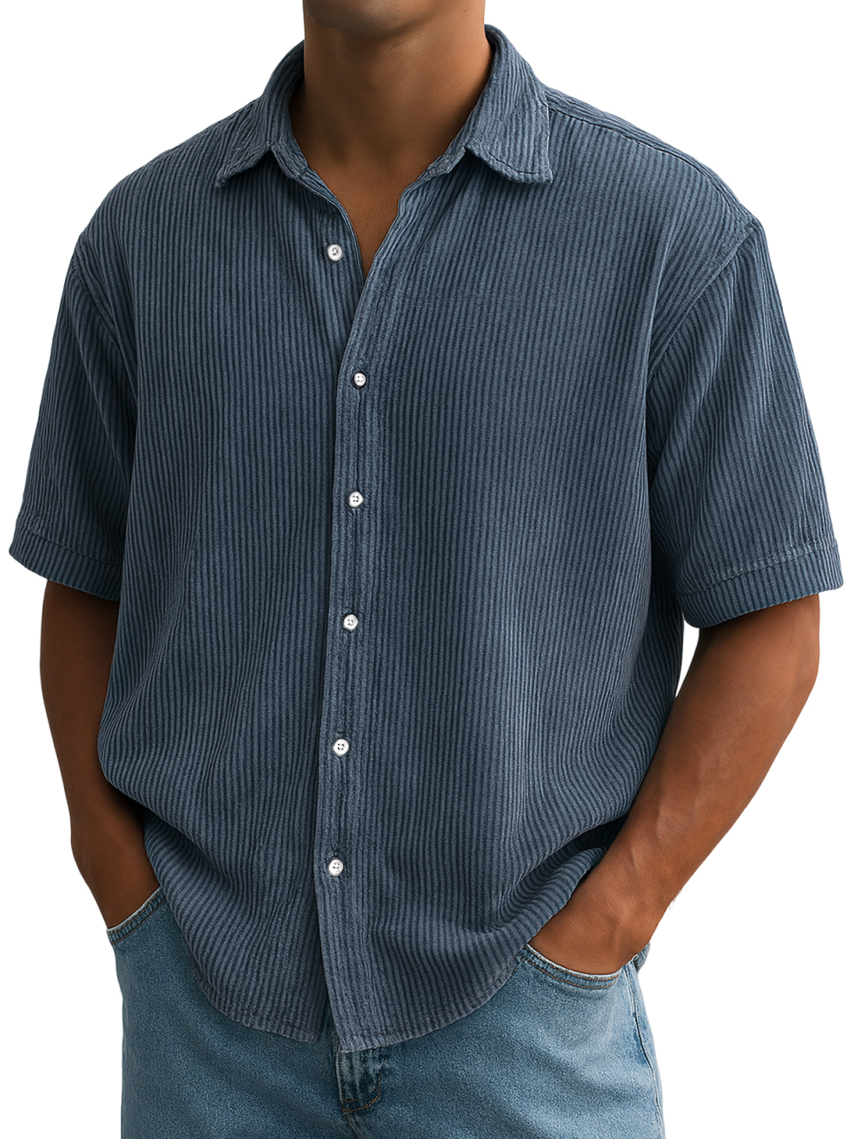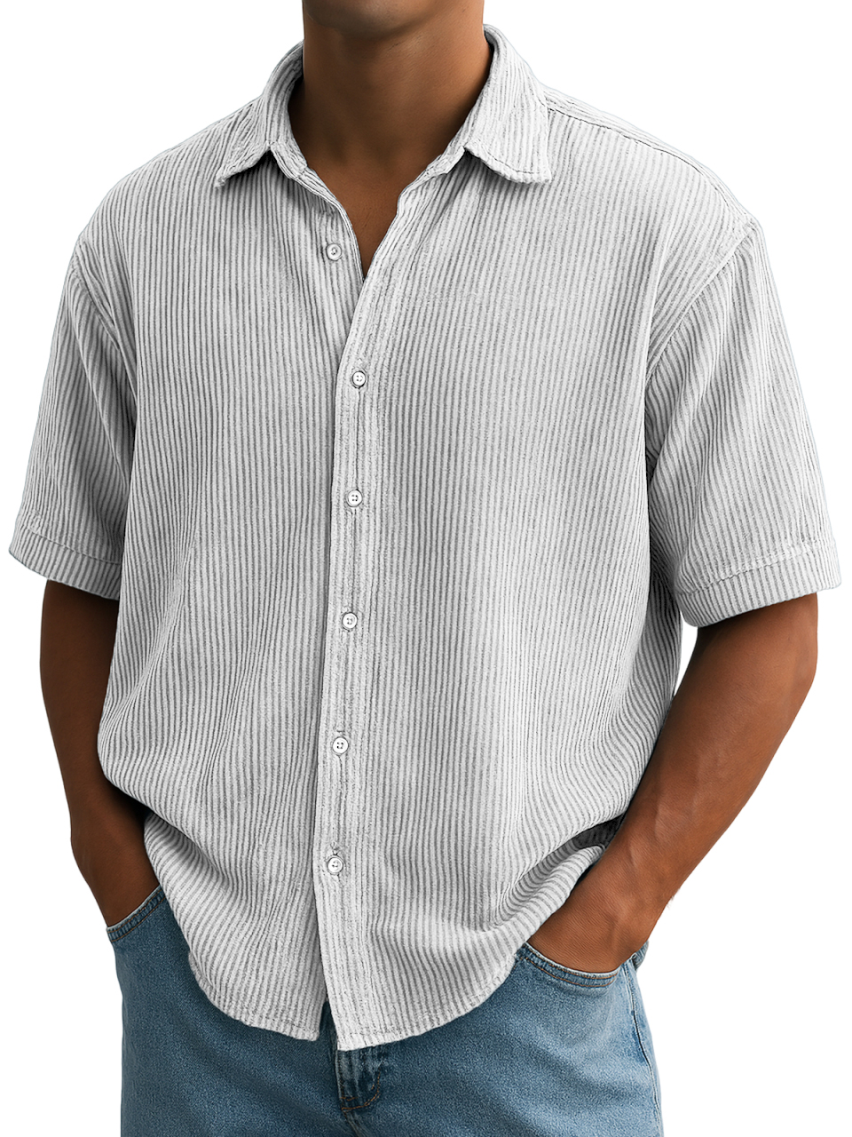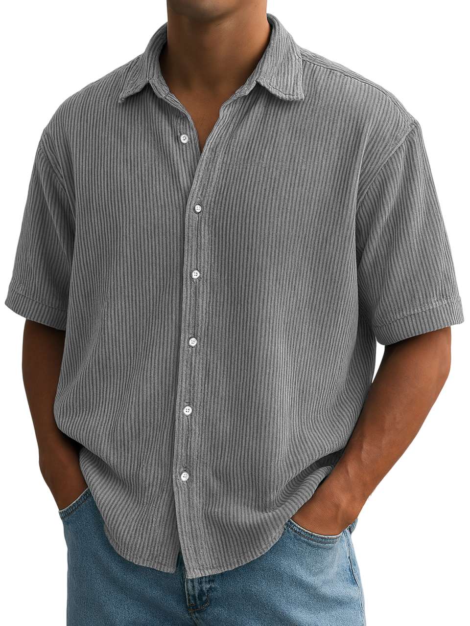 Herren Stilvolle Ripped Vertikale Streifen Corduroy Bequeme Freizeit Kurzarmhemd