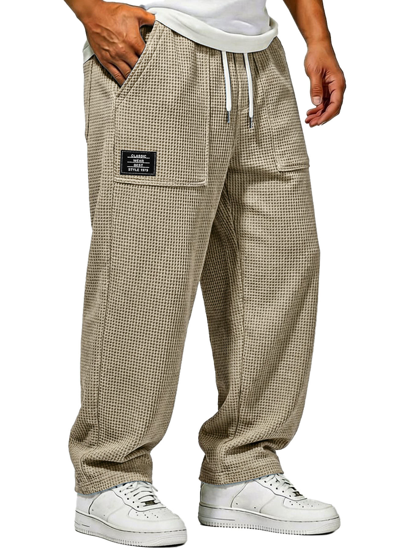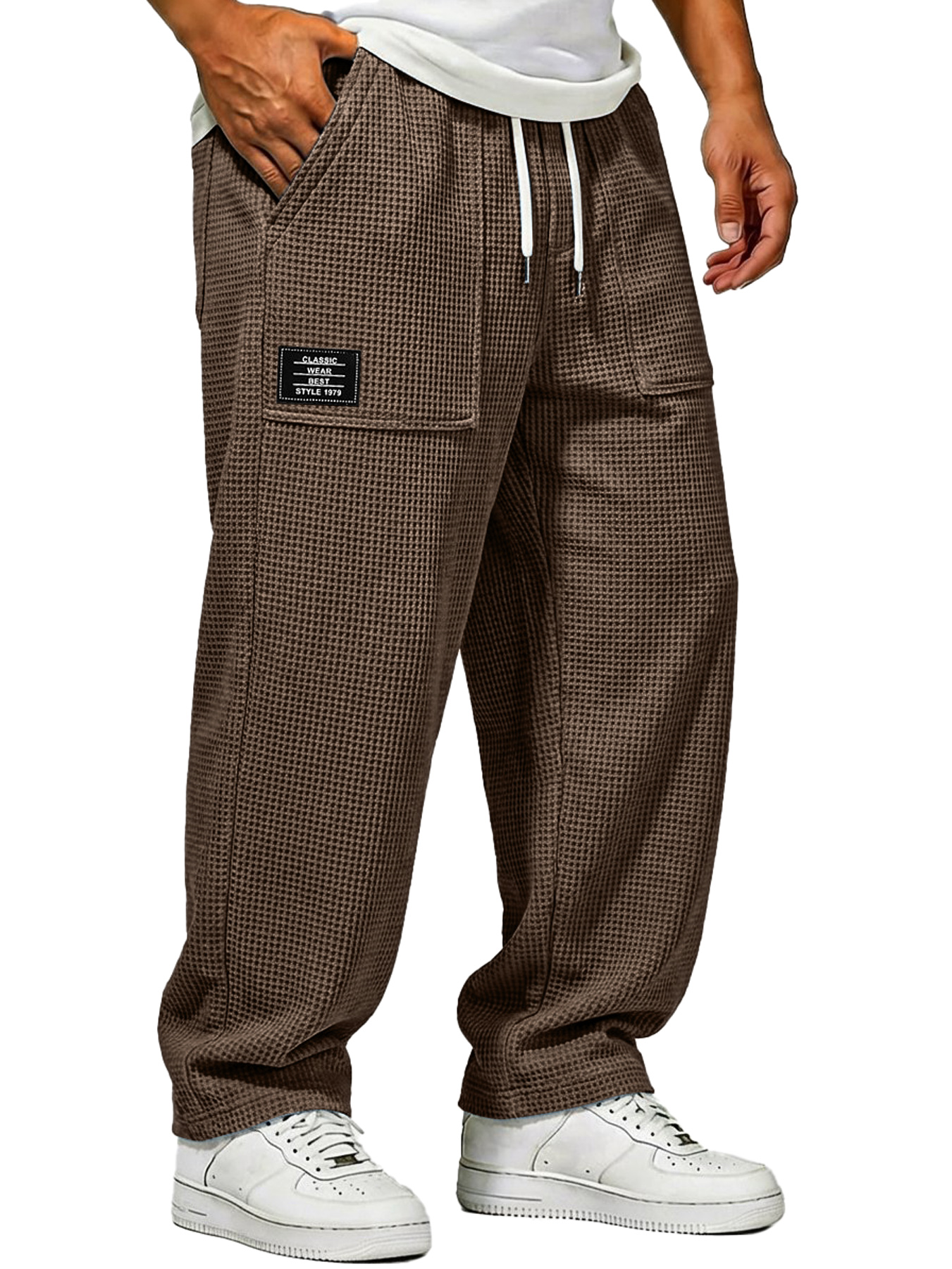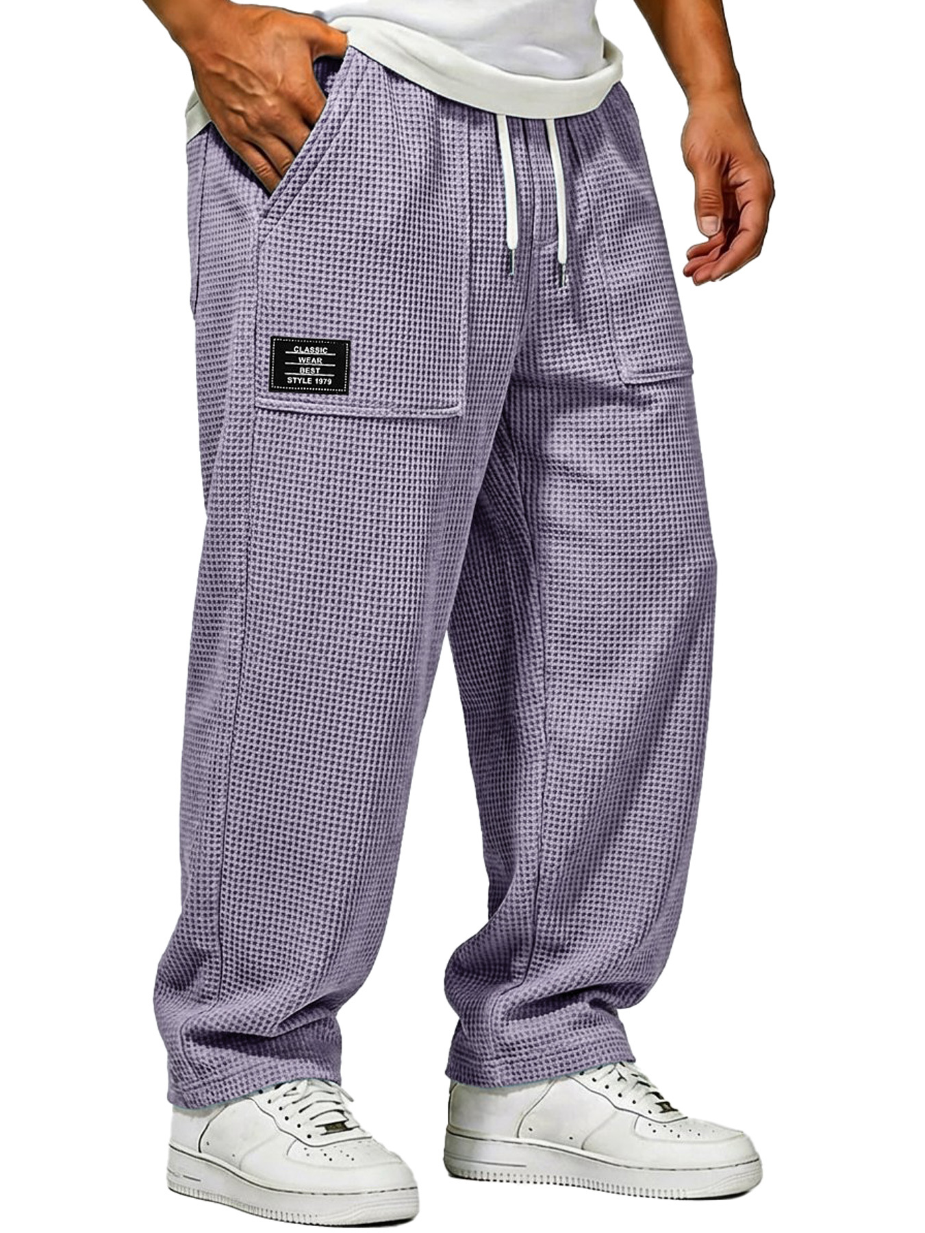 Herren Waffelstrick Freizeitlockere Hose mit aufgesetzten Taschen und gesticktem Logo